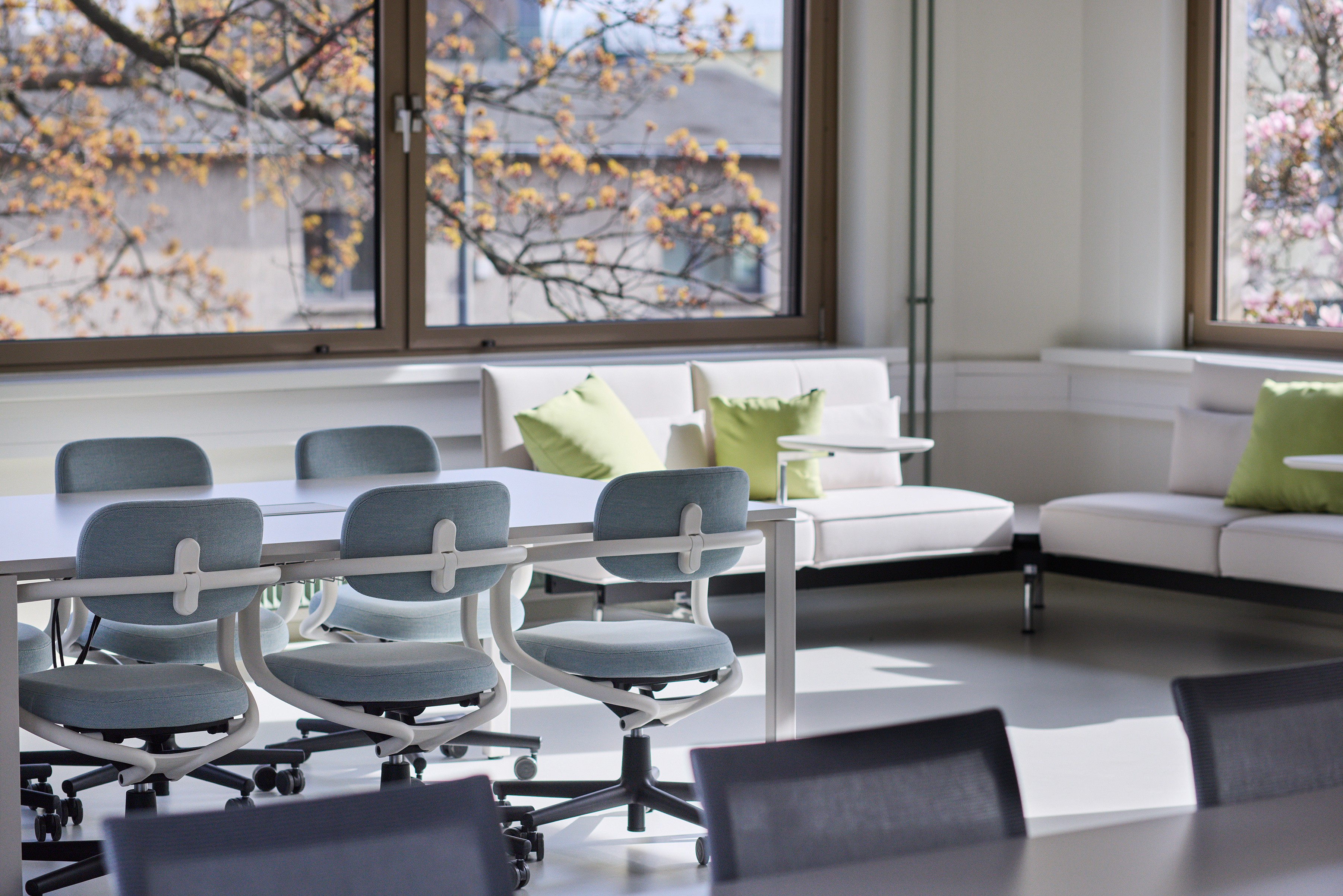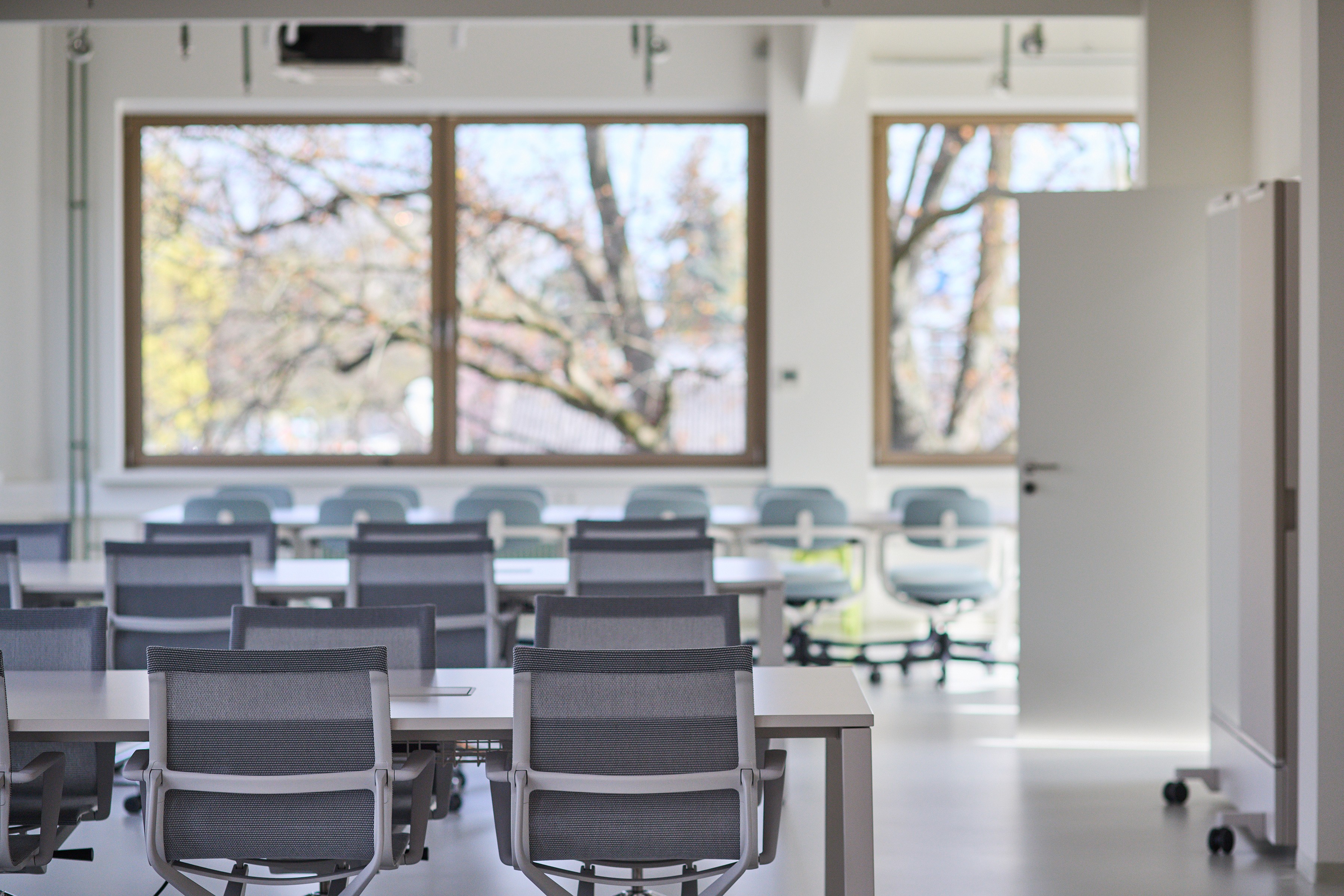 Bright meeting rooms for workshops and presentations, with mixed seating setup.