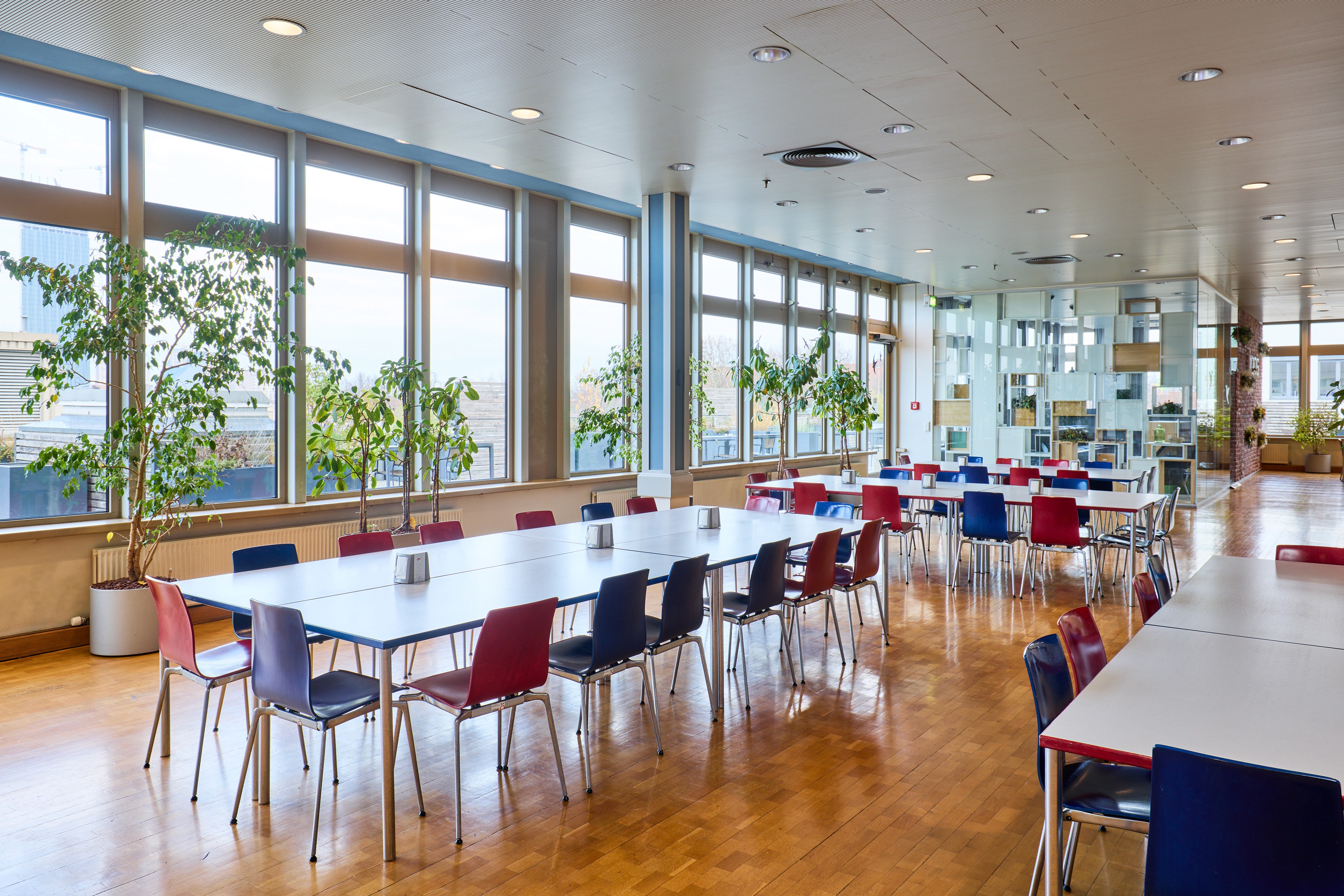 A multi-purpose event space flooded with daylight and connected to adjoining breakout rooms.